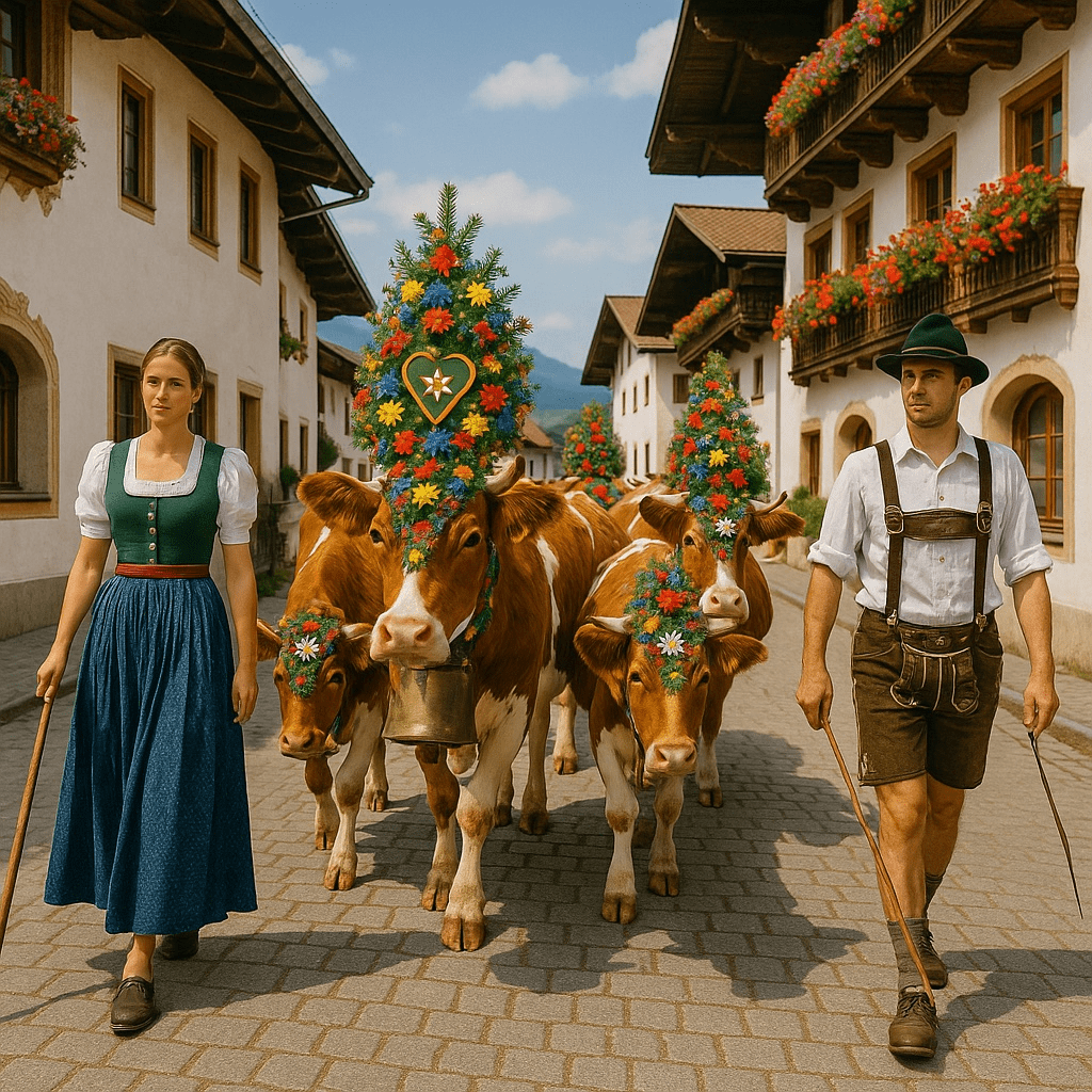 From June to September, cows are led up to the mountain meadows, known as Almen. Up there, the grass is rich, the air is cool, and the animals thrive. But once autumn arrives, the weather changes quickly in the Alps. Snow can fall overnight, and suddenly those lush meadows become dangerous places. So before the first heavy snowfall, the farmers gather their cattle and guide them back down to the safety of the valley farms. That journey is what we call the Almabtrieb.